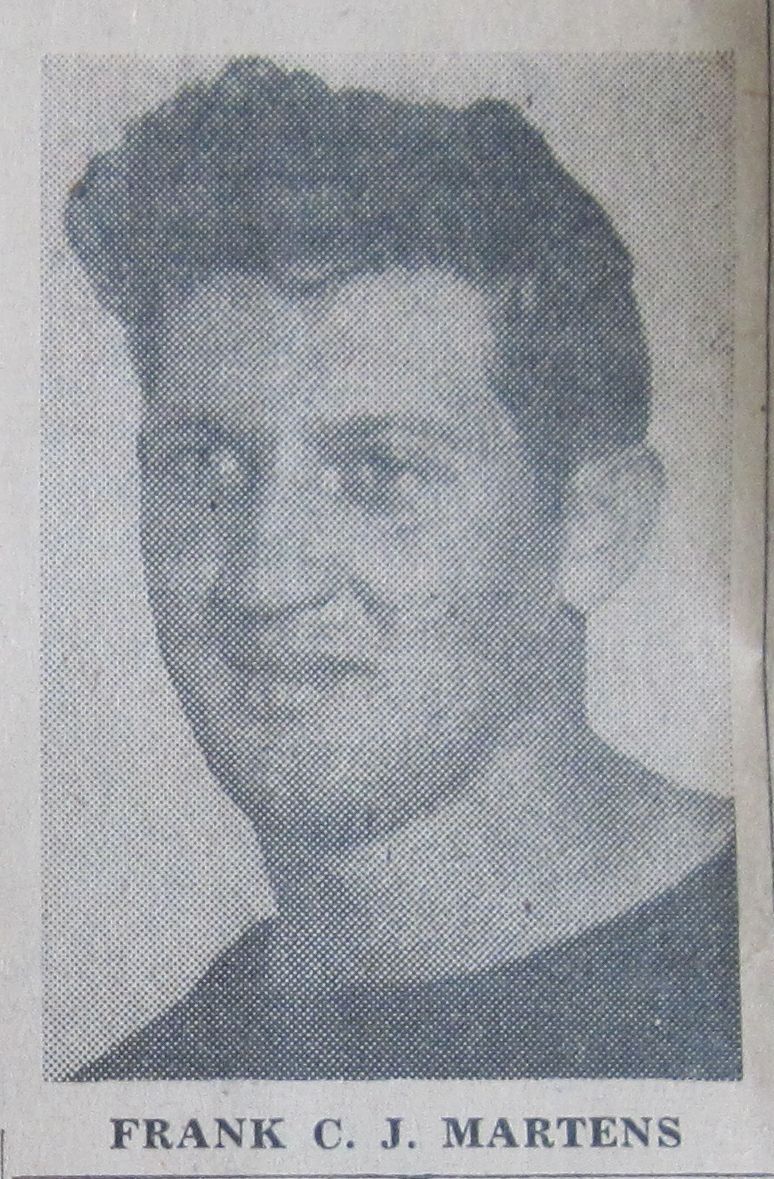 Francis Joseph Louis Martens, 32, was a Merchant Marine veteran. Mr. Martens, who was of Belgian ancestry, served nine years in that branch. Born in New Bedford, he was a lifelong resident of the city. He was educated in Fairhaven schools, attending also the high school in that town. Prior to entering the Merchant Marine, he was employed as a stone cutter and as an operator at the Revere Copper and Brass Company. He entered the Merchant Marine in 1938. He was a former member of the New Bedford Aerie of Eagles and maintained active interest in Merchant Marine programs.